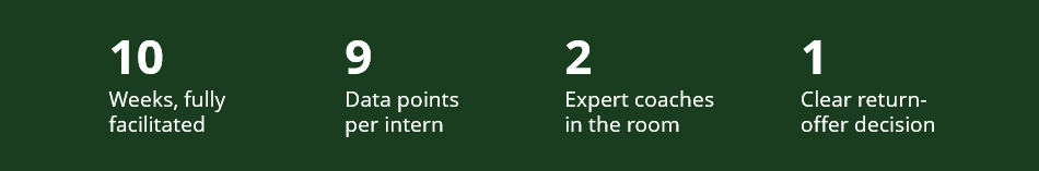 Operator 10 is a live, expert-facilitated performance system that develops your interns from day one and gives you the data to make confident return-offer decisions.